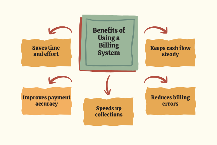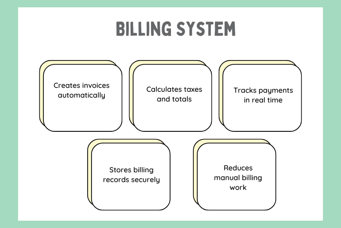 - A Billing System automates invoice creation and payment tracking, reducing manual work and billing errors.