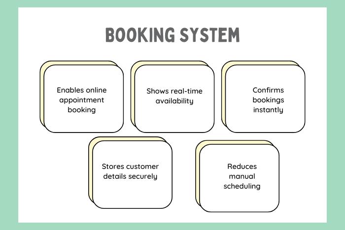 A Booking System is software that allows businesses to manage appointments, reservations, and payments online.