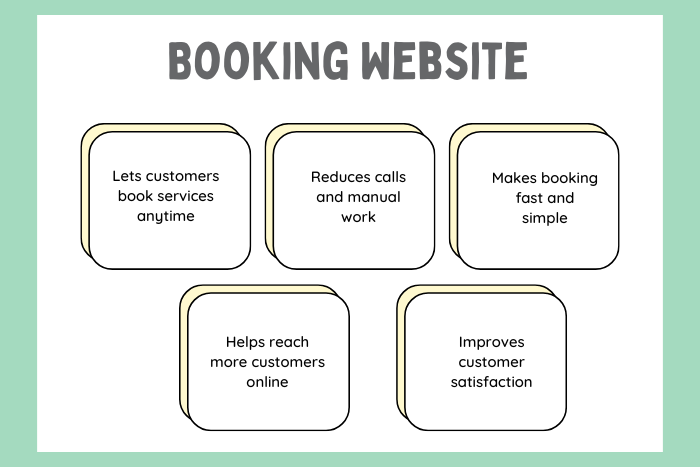 - A booking website allows users to book services online anytime, making reservations fast and convenient.