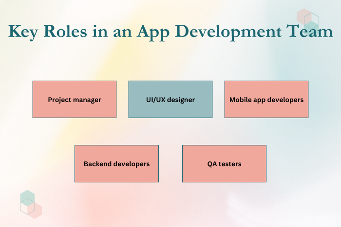 Typical roles include project managers, UI/UX designers, mobile developers, backend engineers, and QA testers.