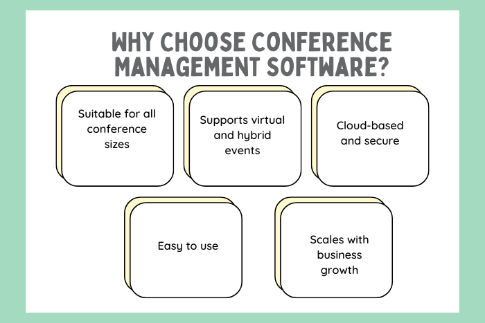 - The software supports in-person, virtual, and hybrid conferences, making it highly flexible.