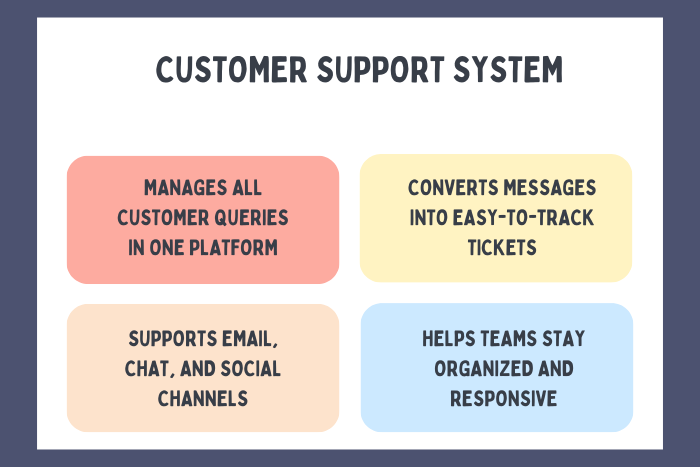 - A Customer Support System helps businesses manage customer queries from email, chat, and social media in one place, making communication simple and organized.