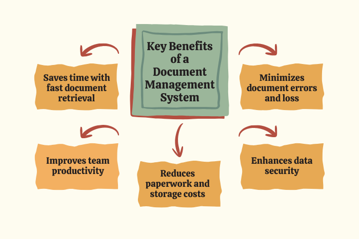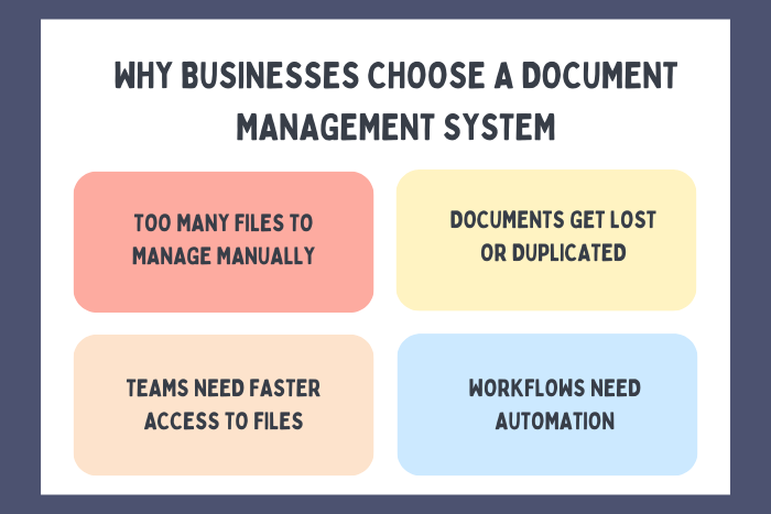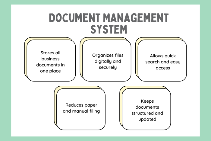 - A Document Management System helps businesses store, organize, and manage digital documents in one secure central platform.