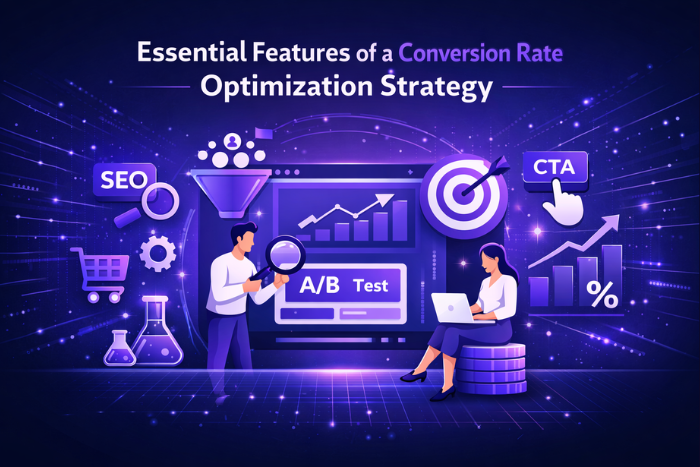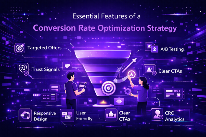 Discover essential features of a conversion rate optimization strategy including A/B testing, user behavior analysis, UX improvements, and data-driven optimization.
