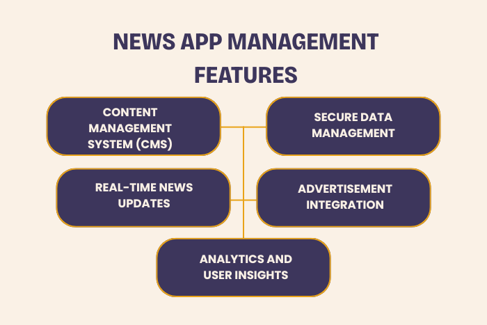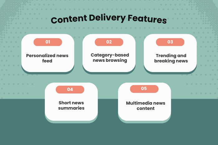 Key features include personalized news feeds, push notifications, multimedia content, offline reading, and social sharing options.