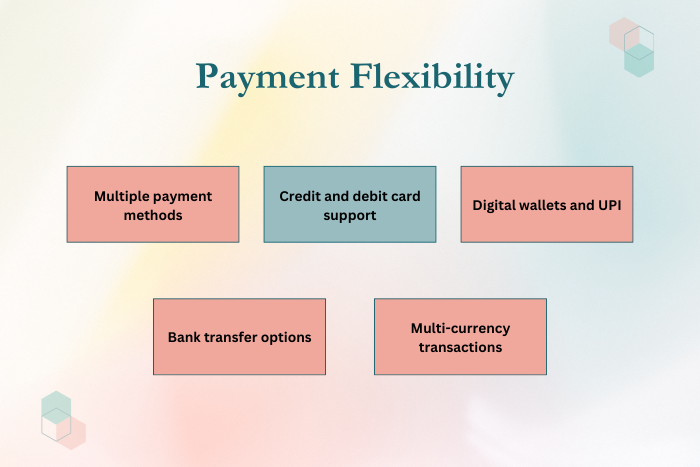 - Multiple payment method support allows customers to pay using credit cards, debit cards, digital wallets, UPI, and bank transfers.