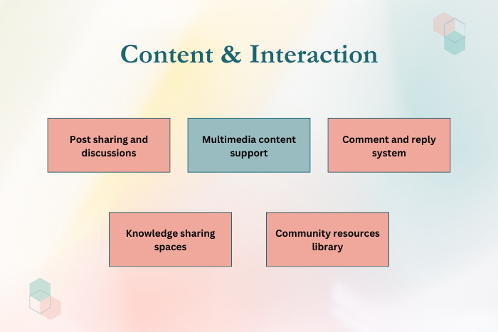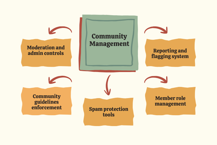Members should be able to share images, videos, and documents.Moderation and Community Guidelines