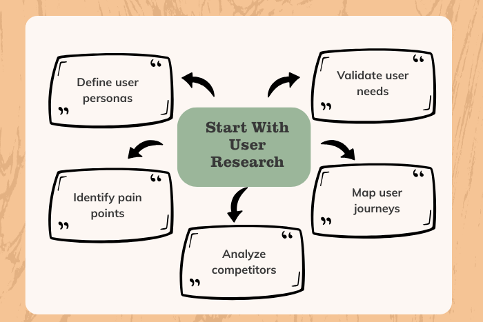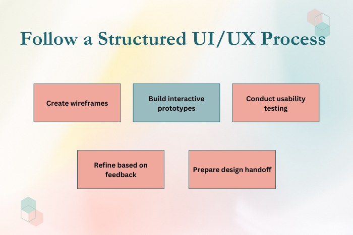 Start with user research, define personas, create wireframes, build prototypes, conduct usability testing, and refine designs before development.