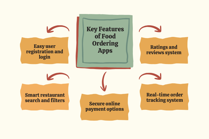 - Essential features include restaurant listings, menu browsing, secure payments, order tracking, and push notifications.