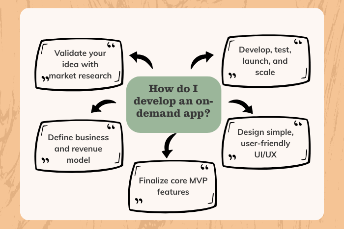 Develop an on demand app , start with market research, define your business model, finalize features, design UI/UX, build backend architecture, develop mobile apps, test thoroughly, and launch with a scaling strategy.