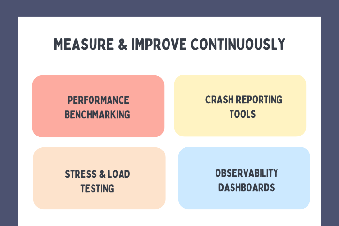 - Real-time monitoring and observability tools such as performance dashboards, crash reporting, and automated alerts.