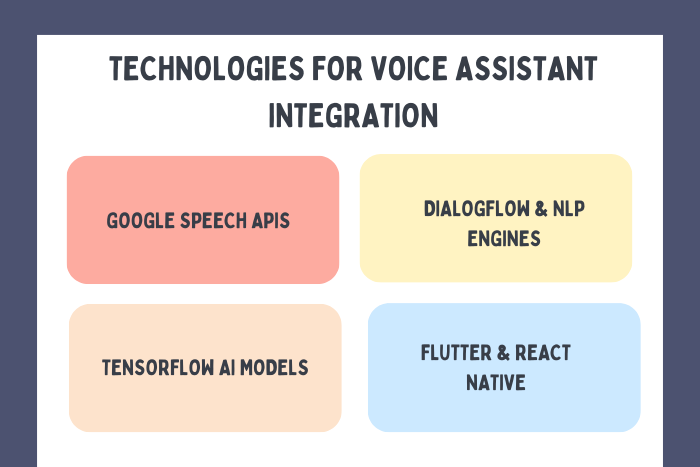 - Voice assistant integration requires APIs, AI frameworks, cloud services, and NLP engines.