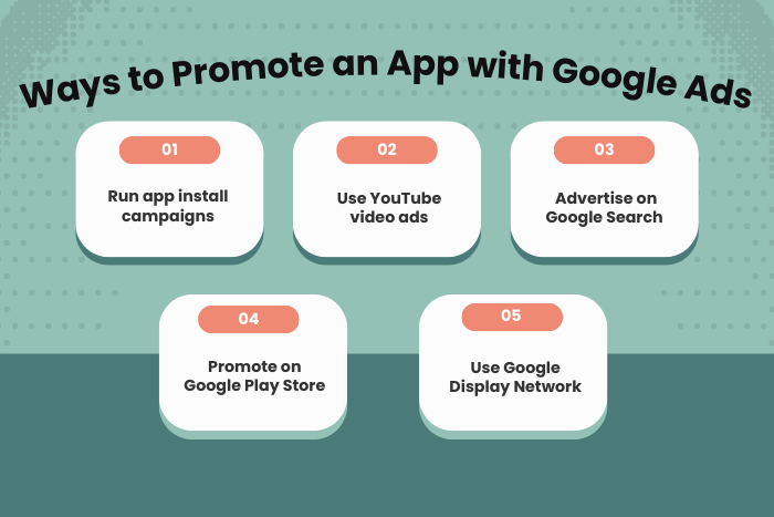 - Google Ads helps promote apps across Search, YouTube, Google Play, and Display Network.