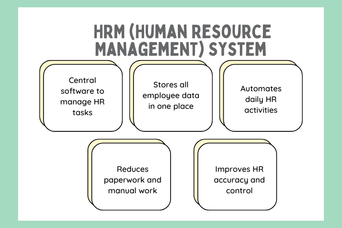 - An HRM (Human Resource Management) System centralizes all employee data in one platform.