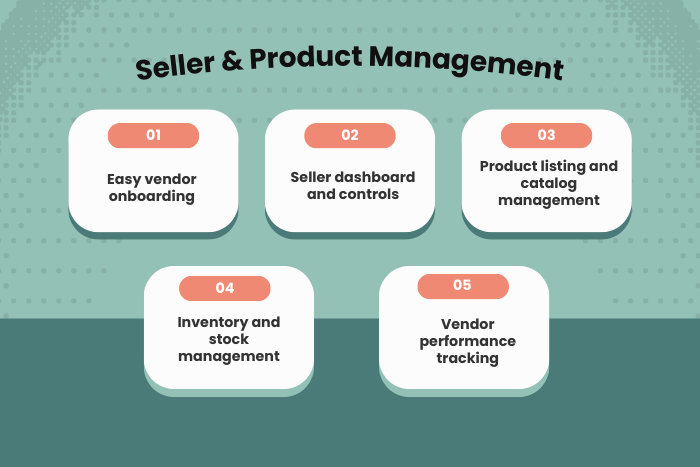 - Product listing and catalog management enable vendors to upload product details, images, pricing, and inventory.