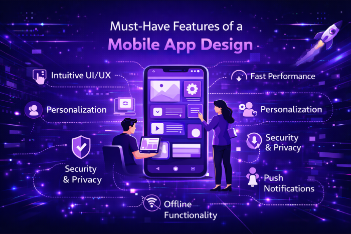 Explore must-have features of a mobile app design including intuitive UI, security, fast performance, push notifications, and cross-platform compatibility.