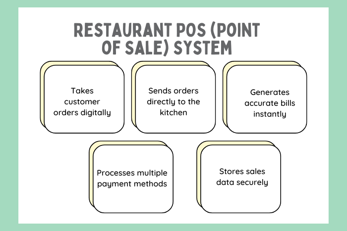 - A Restaurant POS (Point of Sale) System manages orders, billing, and payments digitally.