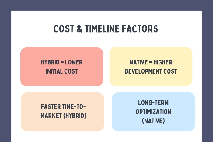 Hybrid development reduces initial costs. Native development may cost more but offers higher optimization. - Maintenance:
