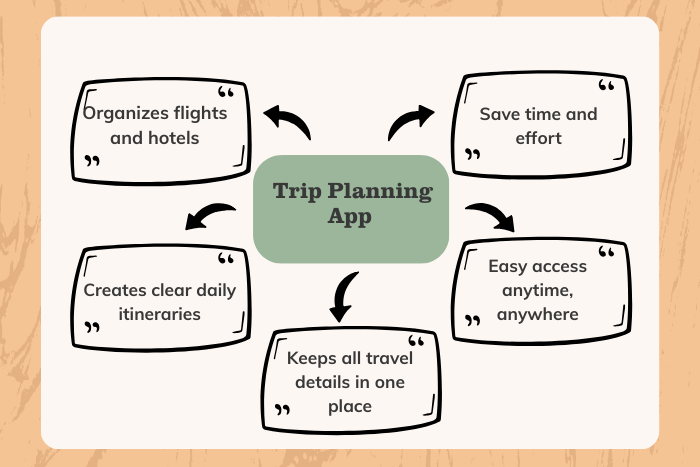 - A trip planning app helps travelers organize flights, hotels, and daily itineraries in one place.
