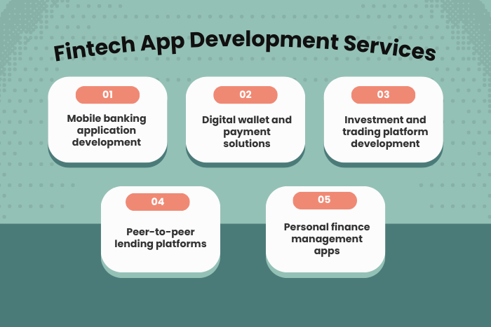 - Fintech app development services include mobile banking, digital wallets, investment platforms, and payment gateway solutions.