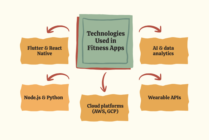 - Technologies like Flutter, React Native, cloud platforms, and AI analytics are widely used in fitness app development.