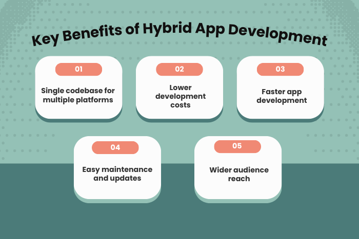 Hybrid apps offer faster development, reduced costs, cross-platform compatibility, and easier maintenance.