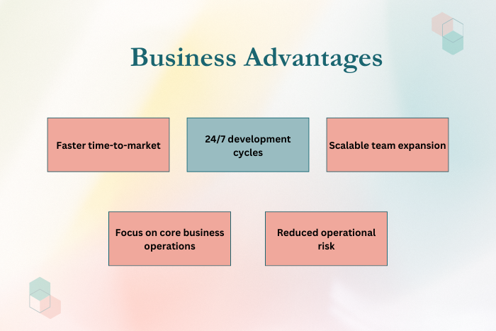 Cost savings, skilled talent, faster delivery, scalability, and advanced technology expertise.