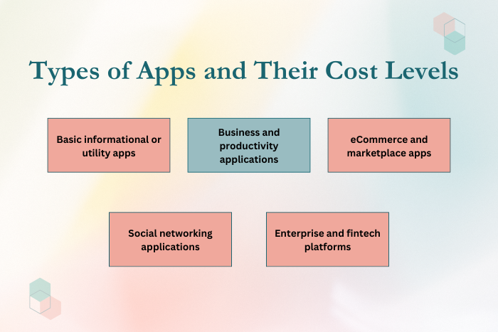 - Different app types such as eCommerce, social networking, enterprise, and on-demand apps have different development cost ranges.