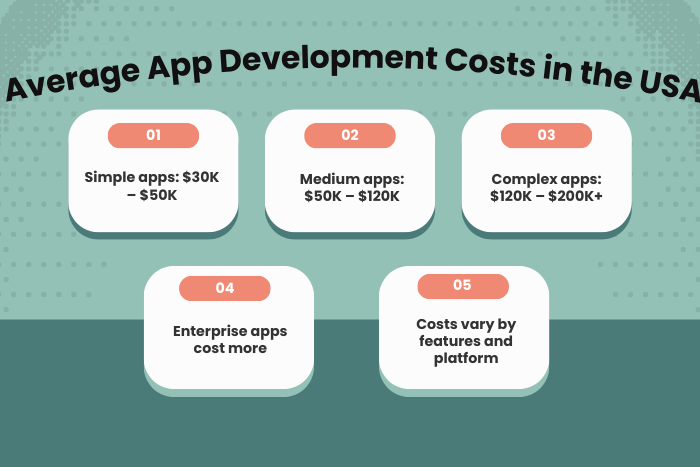 - App development costs in the USA vary based on app complexity and features.