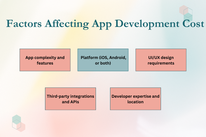 Factors include app complexity, platform choice, design requirements, integrations, and developer expertise.