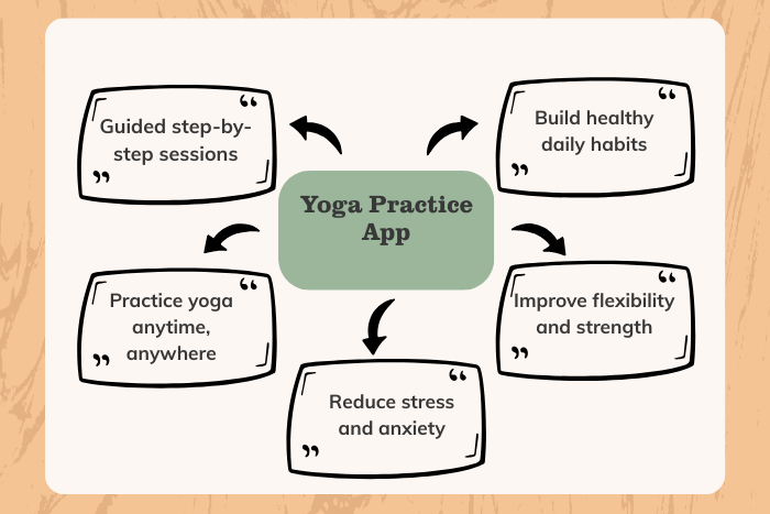 - A yoga practice app allows users to practice yoga anytime and anywhere with guided sessions.